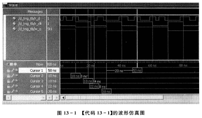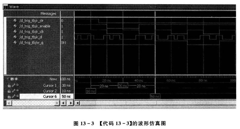 從圖13-3可以看出,在10ns時(shí)刻,雖然在時(shí)鐘信號(hào)r_clk上升沿事件發(fā)生,而且使能信號(hào)r_enable也有效,但是清零信號(hào)r_clr同時(shí)也有效,所以D觸發(fā)器輸出依然沒有更新為此刻輸入信號(hào)r_d的值;在30ns時(shí)刻,雖然在時(shí)鐘信號(hào)r_clk上升沿事件發(fā)生,而且清零信號(hào)r_clr已無效,但是使能信號(hào)r_enable卻無效,所以D觸發(fā)器輸出依然沒有更新為此刻輸入信號(hào)r_d的值;在50ns時(shí)刻,雖然在時(shí)鐘信號(hào)r_clk上升沿事件發(fā)生,使能信號(hào)r_enable也有效,但是清零信號(hào)已無效,所以D觸發(fā)器輸出立即更新為此刻輸入信號(hào)r_d的值。