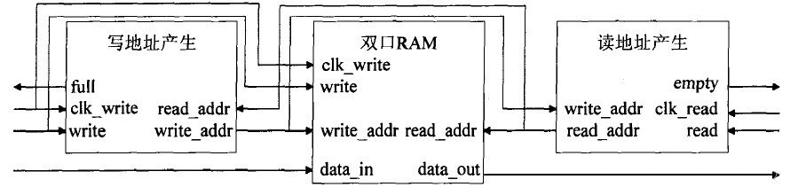 異步FIFOzho中包含:寫地址產(chǎn)生,讀地址產(chǎn)生和一個(gè)雙口RAM。