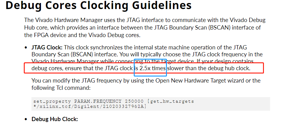 分析:查看 Xilinx 手冊(cè)發(fā)現(xiàn)JATG的時(shí)鐘頻率要比被ILA的時(shí)鐘頻率2.5倍低