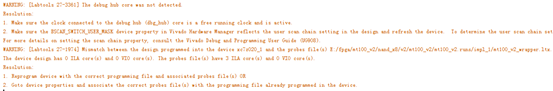 WARNING: [Labtools 27-3123] The debug hub core was not detected at User Scan Chain 1 or 3.Resolution: 1. Make sure the clock connected to the debug hub (dbg_hub) core is a free running clock and is active OR2. Manually launch hw_server with -e "set xsdb-user-bscan" to detect the debug hub at User Scan Chain of 2 or 4. To determine the user scan chain setting, open the implemented design and use: get_property C_USER_SCAN_CHAIN [get_debug_cores dbg_hub].WARNING: [Labtools 27-1974] Mismatch between the design programmed into the device xc7z010_1 and the probes file E:/Xilinx/example/dma_sg_m/dma_sg_m.runs/impl_1/debug_nets.ltx.The device design has 0 ILA core(s) and 0 VIO core(s). The probes file has 1 ILA core(s) and 0 VIO core(s).Resolution: 1. Reprogram device with the correct programming file and associated probes file OR2. Goto device properties and associate the correct probes file with the programming file already programmed in the device.
