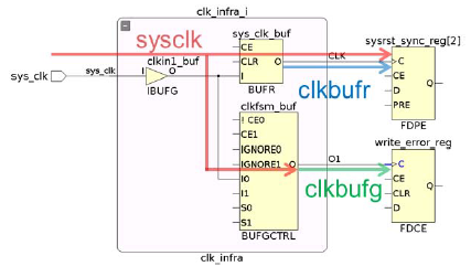 上述例子中BUFG 的輸出端由用戶自定義了一個衍生鐘clkbufg,這個衍生鐘便會覆蓋此處原有的sysclk。此外,圖示BUFR 工作在bypass 模式,其輸出不會自動創(chuàng)建衍生鐘,但在BUFR 的輸出端定義一個衍生鐘clkbufr,并使用 -add 和 -master_clock 選項后,這一點上會存在sysclk 和clkbufg 兩個重疊的時鐘。如下的Tcl 命令驗證了我們的推論。