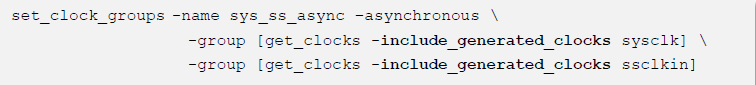 如上圖所示,兩個主時鐘ssclkin 和sysclk 由不同的端口進(jìn)入FPGA,再經(jīng)由不同的時鐘網(wǎng)絡(luò)傳遞,要將它們設(shè)成異步時鐘,可以使用如下約束: