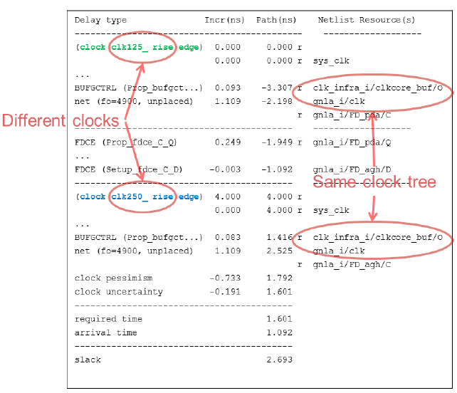 重疊時鐘是指多個時鐘共享完全相同的時鐘傳輸網(wǎng)絡(luò),例如兩個時鐘經(jīng)過一個MUX 選擇后輸出的時鐘,在有多種運行模式的設(shè)計中很常見。Vivado 使用誤區(qū)與進(jìn)階如下圖所示,clk125 和clk250 是clkcore_buf 的兩個輸入時鐘,不約束時鐘關(guān)系的情況下,Vivado 會對圖示路徑做跨時鐘域(重疊時鐘之間)分析。這樣的時序報告即便沒有違例,也是不可信的,因為clk125 和clk250 不可能同時驅(qū)動這條路徑上的時序元件。這么做也會增加運行時間,并影響最終的實現(xiàn)效果。