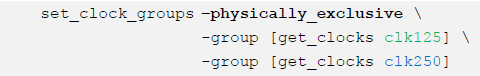 其中,-include_generated_clocks 表示所有衍生鐘自動跟其主時鐘一組,從而與其它組的時鐘之間為異步關(guān)系。不加這個選項則僅僅將時鐘關(guān)系的約束應(yīng)用在主時鐘層面。