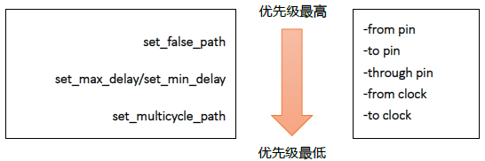 這類約束除了要滿足XDC 的先后順序優(yōu)先級外,還受到自身優(yōu)先級的限制。一個總的原則就是針對同一條路徑,對約束目標(biāo)描述越具體的優(yōu)先級越高。不同的時序例外約束以及同一約束中不同條件的優(yōu)先級如下所示:
