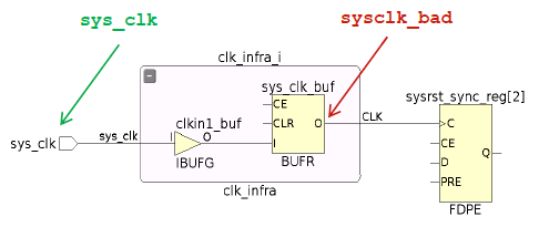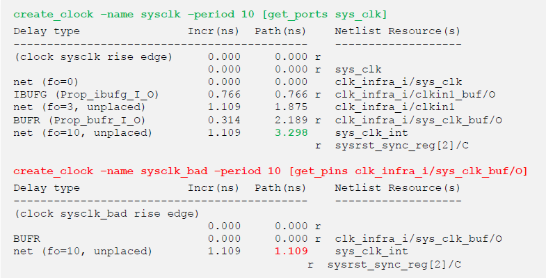 用create_clock 定義的主時鐘的起點即時序的“零起點”,在這之前的上游路徑延時都被工具自動忽略。所以主時鐘創(chuàng)建在哪個“點”很重要,以下圖所示結(jié)構(gòu)來舉例,分別于FPGA 輸入端口和BUFG 輸出端口創(chuàng)建一個主時鐘,在時序報告中體現(xiàn)出的路徑延時完全不同,很明顯sysclk_bad 的報告中缺少了之前一段的延時,時序報告不可信。