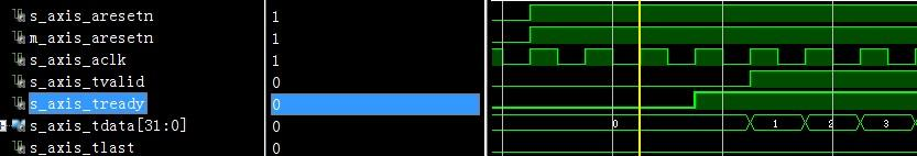 STREAM FIFO的復(fù)位信號為低有效,當(dāng)復(fù)位信號拉高后的第三個時鐘上升沿s_axis_tready信號會自動拉高,該fifo處于等待接收數(shù)據(jù)狀態(tài)。