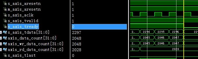 當(dāng)STREAM FIFO內(nèi)部的數(shù)據(jù)達(dá)到fifo的深度時,在接收進(jìn)最后一個數(shù)據(jù)的同時,s_axis_tready將會變?yōu)榈?,告訴前級fifo已滿,不能在收數(shù)據(jù)了。其實S_axis_tready信號相當(dāng)于普通FIFO的full與empty信號的綜合體。