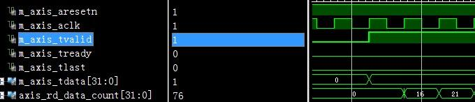 對STREAM FIFO 的MASTER接口為FIFO的數(shù)據(jù)輸出接口。當(dāng)STREAM FIFO接收到數(shù)據(jù)并傳到MASTER接口上時,m_axis_tvalid便會拉高,由于使用的STREAM FIFO為異步時鐘模式,數(shù)據(jù)寫入時鐘比數(shù)據(jù)讀出時鐘要快,而讀數(shù)據(jù)計數(shù)器的刷新是在讀數(shù)據(jù)時鐘的上升沿,所以可以從圖中看到讀數(shù)據(jù)計數(shù)器的值是跳躍上升的。當(dāng)FIFO的后端將m_axis_tready拉高時,MASTER接口便會將數(shù)據(jù)送出去。