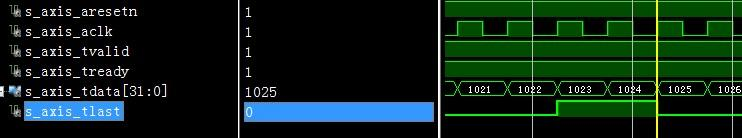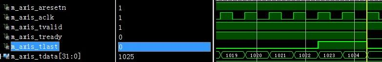 從MASTER接口的數(shù)據(jù)流可以看出,將數(shù)據(jù)1023和數(shù)據(jù)1024讀出的同時也會將m_axis_tlast信號拉高。