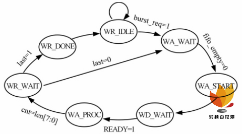 AXI master 初始化后進(jìn)入 WR_IDLE 狀態(tài), 復(fù)位所有控制信號(hào)和數(shù)據(jù)信號(hào),在接收到數(shù)據(jù)傳輸請(qǐng)求信號(hào) burst_req 后進(jìn)入 WA_WAIT 狀態(tài),更新外部輸入的數(shù)據(jù)、數(shù)據(jù)長(zhǎng)度 len 和起始地址。如果 FIFO 不為空,進(jìn)入 WA_START 狀態(tài),在此狀態(tài)下與 AXI_HP 接口進(jìn)行握手并給 last 信號(hào)賦值,由于最大突發(fā)長(zhǎng)度為 256,在傳輸結(jié)束時(shí)需要根據(jù) last 信號(hào)判斷是否需要進(jìn)行再一次傳輸,若數(shù)據(jù)長(zhǎng)度 len 大于 256 , last 信號(hào)置 0 ,否則置 1 。在 WA_PROC 狀態(tài)輸出 AXI 可寫信號(hào) burst_data_req ,對(duì)計(jì)數(shù)器 cnt 進(jìn)行累加。WR_DONE 狀態(tài)輸出傳輸完成信號(hào) burst_finish 。