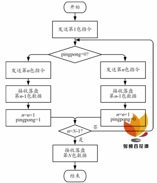 為提高速度,在 PL 寫入 DDR3 、 Linux 讀取 DDR3通過(guò) TCP 發(fā)送和上位機(jī)接收數(shù)據(jù)寫入磁盤三部分采用乒乓操作。DDR3 被分為高、低地址兩部分,光纖數(shù)據(jù)被乒乓寫入 2 塊空間。Linux 將 2 塊空間數(shù)據(jù)乒乓發(fā)送,讀到低地址標(biāo)識(shí)后讀取低地址數(shù)據(jù),同時(shí)發(fā)送高地址數(shù)據(jù)。上位機(jī)先發(fā)送 2 次傳輸指令,使發(fā)送傳輸指令與判斷接收完成這 2 個(gè)操作錯(cuò)位以實(shí)現(xiàn)并行處理的優(yōu)化方案。在開(kāi)始傳輸后,上位機(jī)預(yù)先發(fā)送傳輸一包數(shù)據(jù)的指令給記錄器, 再按照發(fā)一包指令、收一包數(shù)據(jù)的流水線處理,并且建立 2 條流水線以實(shí)現(xiàn)數(shù)據(jù)接收和數(shù)據(jù)落盤的乒乓操作,到最后一包時(shí)不發(fā)送指令,只接收數(shù)據(jù)。此方案在上位機(jī)接收數(shù)據(jù)時(shí)數(shù)據(jù)傳輸系統(tǒng)可以準(zhǔn)備好下一包的數(shù)據(jù)等待上位機(jī)接收,在處理連續(xù)數(shù)據(jù)時(shí)可大幅提升傳輸速度。優(yōu)化策略流程圖如圖 5 所示。