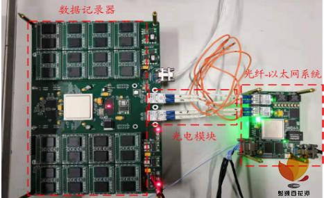 數(shù)據(jù)傳輸系統(tǒng)使用 5 V 電壓供電。本文通過(guò)在嵌入式 Linux 下移植 iperf3 帶寬測(cè)試軟件進(jìn)行測(cè)試,最終測(cè)得此以太網(wǎng)鏈路速率為 850 Mb/s 。測(cè)試使用信號(hào)源為雷達(dá)原始數(shù)據(jù)記錄器,該記錄器理論傳輸速度為3200 Mb/s ,高于千兆以太網(wǎng)的最大速率,不會(huì)影響測(cè)試結(jié)果。數(shù)據(jù)傳輸系統(tǒng)通過(guò) 2 路光纖線纜連接記錄器,六類網(wǎng)線連接 PC 上位機(jī)。在 PC 上位機(jī)進(jìn)行數(shù)據(jù)傳輸測(cè)試,測(cè)試電路實(shí)物圖如圖 6 所示,右側(cè)為數(shù)據(jù)傳輸系統(tǒng)。