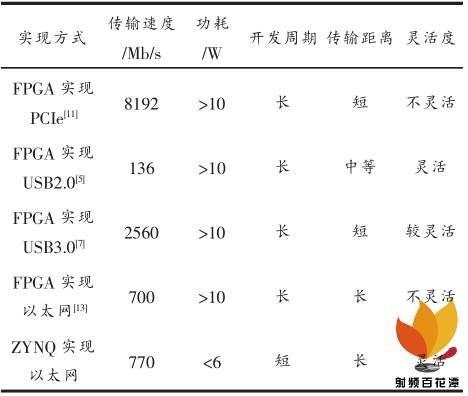 本設(shè)計(jì)與傳統(tǒng)數(shù)據(jù)傳輸方式性能對(duì)比如表 2 所示。與 PCIe 、 USB3.0 相比, ZYNQ 在功耗、傳輸距離和靈活度上具有明顯優(yōu)勢(shì), 更適用于外場(chǎng)試驗(yàn)環(huán)境,同時(shí)傳輸速率較高,接近磁盤寫入速度,滿足應(yīng)用要求。