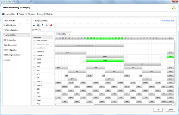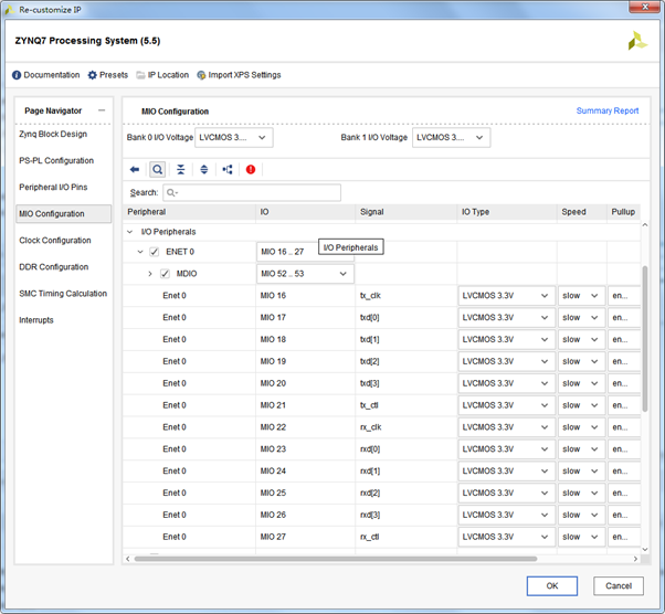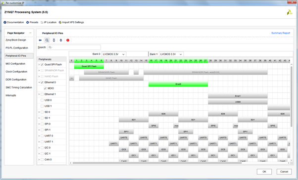 zynq外接了SPI Flash 和 Eethernet控制器,當這兩個外設被選擇后,MIO[6:1]和MIO[27:16]就被占用了。在MIO Configuration頁可以看到具體的分配關系,如下圖: