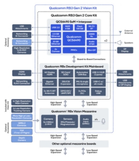 Qualcomm RB3 Gen 2開發(fā)套件采用模塊化設(shè)計(jì),遵循96Boards緊湊型信用卡尺寸規(guī)格,支持基于Vision Mezzanine的一系列夾層板擴(kuò)展,兼具小巧外形與高度擴(kuò)展性。另外,該套件提供豐富的連接選項(xiàng),包括多個(gè)USB接口、以太網(wǎng)口、攝像頭和顯示端口,并支持各類GPIO,可同時(shí)滿足低速通信協(xié)議與高速連接的需求。