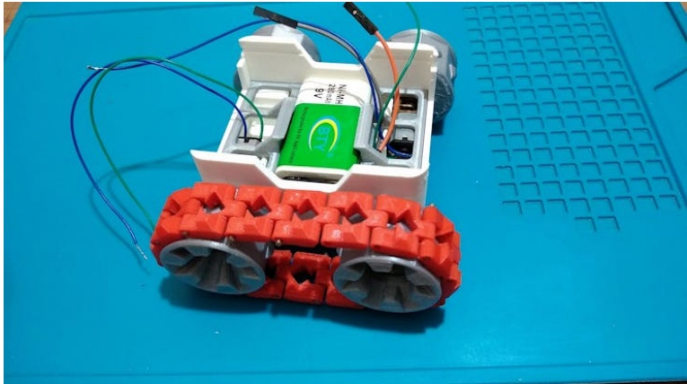 我們繼續(xù)我們機器人的組裝零件,我們將開始與車輪的鏈我們需要這些32鏈部分16個部分每一方和我們用這個塑料絲削減30個部分,每個部分都有15毫米的長度和我們一起保持鏈部分,您可以使用一些膠,以確保鏈保持連接,現(xiàn)在我們把機器人底盤和這兩個免費的輪子我們組裝在一起,之后,我們把9V電池和微型電機放在他們的位置,我們組裝主動車輪到電機上,最后但并非最不重要的是,我們把鏈條連接車輪彼此,最后一步是擰緊車輪電線和9V電池,然后我們把PCB插入其插座,我們的機器人現(xiàn)在準(zhǔn)備移動了。