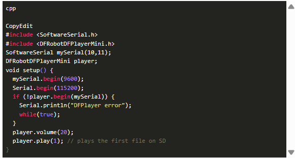 使用DFRobotDFPlayerMini庫,一個(gè)簡(jiǎn)單的草圖可以:
