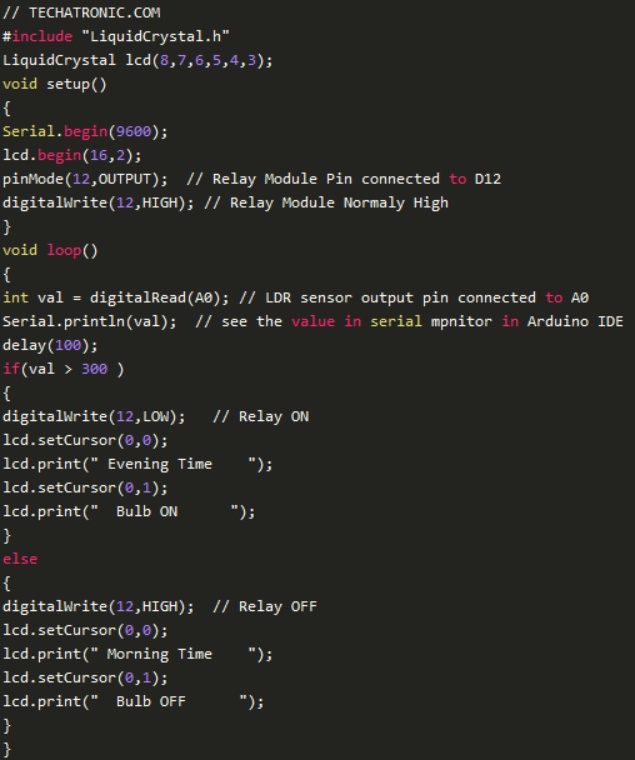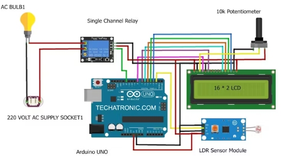 LDR模塊產(chǎn)生的輸出取決于落在其上表面的光。在白天,陽(yáng)光照射在LDR上,所以交流電燈泡關(guān)閉,日落之后,沒(méi)有明亮的光源,所以交流電燈泡打開(kāi)。通過(guò)使用這個(gè)概念,我們可以設(shè)法每天節(jié)省足夠的能量。