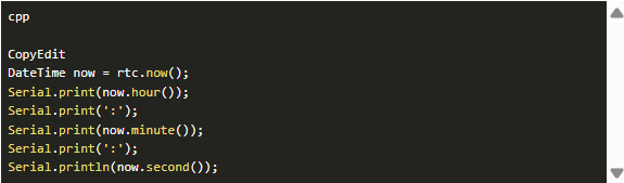 代碼首先初始化RTC并檢查它是否正在運(yùn)行。如果是第一次設(shè)置,可以使用rts .adjust()設(shè)置時(shí)間。之后,您可以使用rtc連續(xù)讀取當(dāng)前時(shí)間和日期?,F(xiàn)在(),然后打印或顯示在LCD或串行監(jiān)視器上。