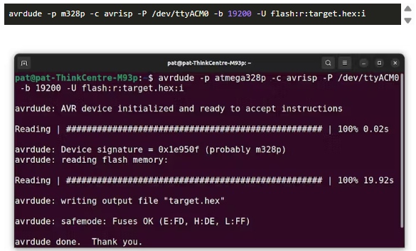 注意,avrdude已經(jīng)讀取了目標(biāo)芯片的保險絲設(shè)置。當(dāng)您通過串行端口編程Uno板時,這些值將被阻止。