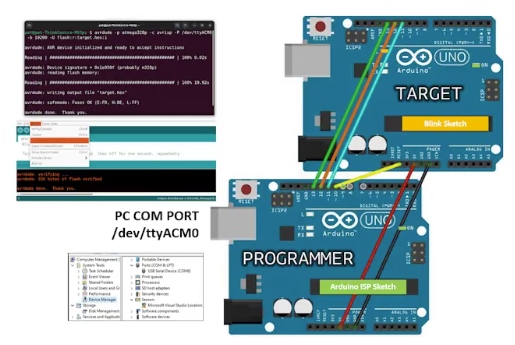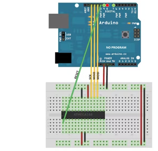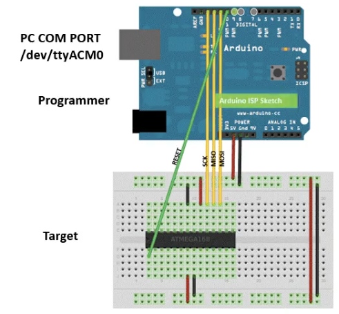 這是一個普通的草圖包含在示例- bbbb11 . arduinoisp。閱讀一些代碼,看看作者是怎么說的。下面的Arduino Uno表示編程設(shè)備。