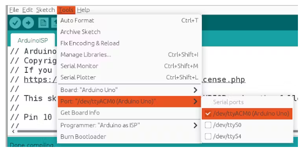 刷新編程板中的ArduinoISP草圖。驗證端口號。
