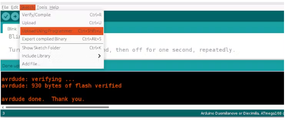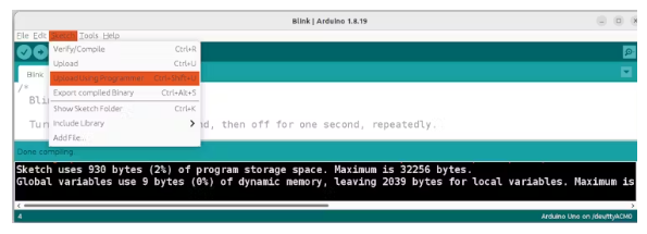 菜單草圖->上傳使用程序員或按ctrl+shift+U鍵盤。Arduino IDE程序?qū)⒁灾蓖J脚c程序員交談以到達(dá)目標(biāo)設(shè)備。