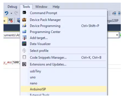 查看Tools- b> Programmer的菜單,你會看到很多選擇。選擇Arduino作為ISP。