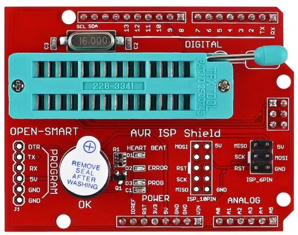AVR ISP Arduino編程屏蔽帶28pin ZIF插座,可容納ATmega328p, ATmega8和ATmega168芯片。您可以在服務(wù)編程頭中對具有6針和10針I(yè)SP/ICSP的其他板進(jìn)行編程。
