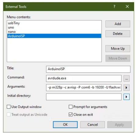 我們將調(diào)用新的外部工具ArduinoISP。在這臺計算機(jī)上,參數(shù)需要是
