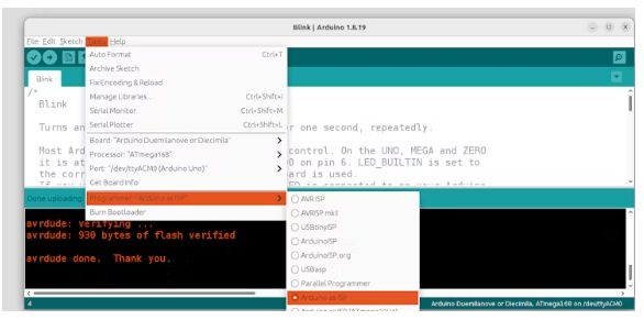 要對設(shè)備進(jìn)行編程,請使用菜單Tools- b> ArduinoISP,當(dāng)avrdude執(zhí)行時,黑色命令窗口將閃爍。