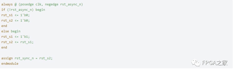 在進(jìn)行異步復(fù)位同步釋放的時(shí)候一定能夠要進(jìn)行至少兩次緩存,這樣才能保證亞穩(wěn)態(tài)串?dāng)_的可能性大大降低。(上述代碼為兩次緩存)