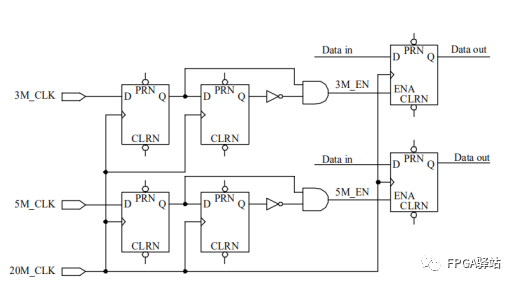 在許多應用中只將異步信號同步化還是不夠的,當系統(tǒng)中有兩個或兩個以上非同源時鐘的時候,數(shù)據(jù)的建立和保持時間很難得到保證,設計人員將面臨復雜的時間分析問題。最好的方法是將所有非同源時鐘同步化。這時就需要使用帶使能端的D觸發(fā)器, 并引入一個高頻時鐘來實現(xiàn)信號的同步化。具體如下圖所示: