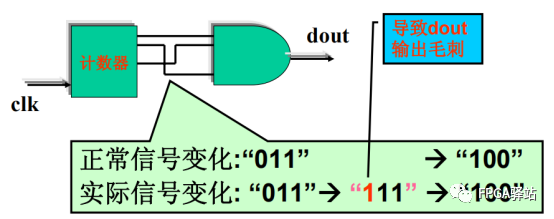 異步電路的邏輯核心是用組合邏輯電路實現(xiàn),比如異步的FIFO/RAM讀寫信號,地址譯碼等電路。電路的主要信號、輸出信號等并不依賴于任何一個時鐘性信號,不是由時鐘信號驅(qū)動FF產(chǎn)生的。異步時序電路的最大缺點是容易產(chǎn)生毛刺,毛刺產(chǎn)生的機理主要有爭和冒險導致毛刺、組合延時和布線延時不平衡導致譯碼輸出毛刺以及線間的信號耦合導致毛刺。具體如下圖所示: