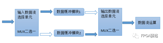 在第一個緩沖周期,將輸入的數(shù)據(jù)流緩存到“ 數(shù)據(jù)緩沖模塊 1”;在第 2 個緩沖周期,通過“ 輸入數(shù)據(jù)選擇單元 ”的切換,將輸入的數(shù)據(jù)流緩存到“ 數(shù)據(jù)緩沖模塊 2”,同時將“ 數(shù)據(jù)緩沖模塊 1”緩存的第 1 個周期數(shù)據(jù)通過“ 輸入數(shù)據(jù)選擇單元 ”的選擇,送到“ 數(shù)據(jù)流運算處理模塊 ”進行運算處理;在第 3 個緩沖周期通過“ 輸入數(shù)據(jù)選擇單元 ”的再次切換,將輸入的數(shù)據(jù)流緩存到“ 數(shù)據(jù)緩沖模塊 1”,同時將“ 數(shù)據(jù)緩沖模塊 2”緩存的第 2 個周期的數(shù)據(jù)通過“ 輸入數(shù)據(jù)選擇單元 ”切換,送到“ 數(shù)據(jù)流運算處理模塊 ”進行運算處理。如此循環(huán)。