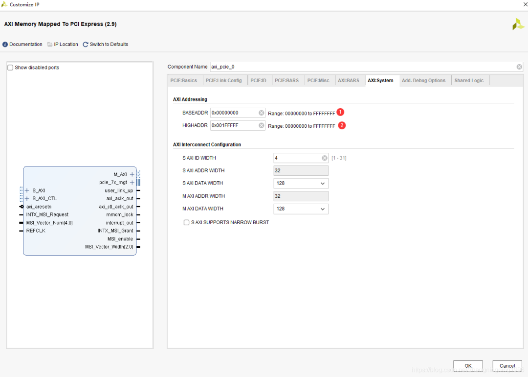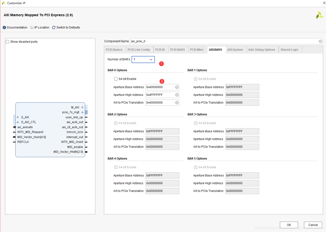 2、主機側(cè)PCIE BAR 地址與用戶邏輯側(cè)地址是不一樣的,這個設(shè)置就是進行BAR 地址到AXI 地址的轉(zhuǎn)換,比如主機一側(cè) BAR 地址為0, IP 里面轉(zhuǎn)換設(shè)置為 0x80000000,則主機訪問 BAR 地址 0 轉(zhuǎn)換到AXI LIte 總線地址就是0x80000000,這點的理解特別重要