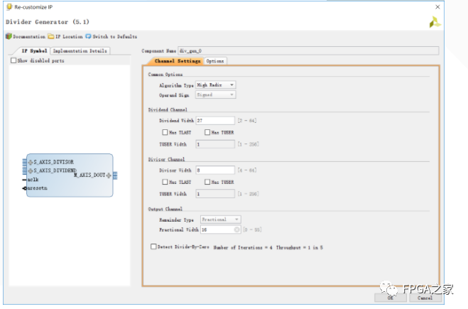 需要注意一點,F(xiàn)PGA將所有有符號數(shù)視為二進制補碼形式,運算的結(jié)果同樣為補碼。再來看看除法器IP核配置界面。