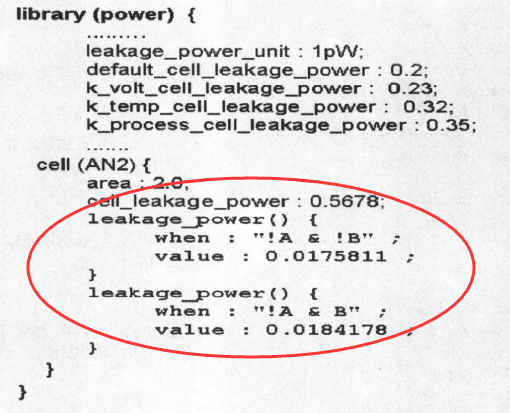 靜態(tài)功耗/漏電功耗也是由特性工具預(yù)先處理,存放在工藝庫里面。工藝庫中的靜態(tài)功耗信息如下所示: