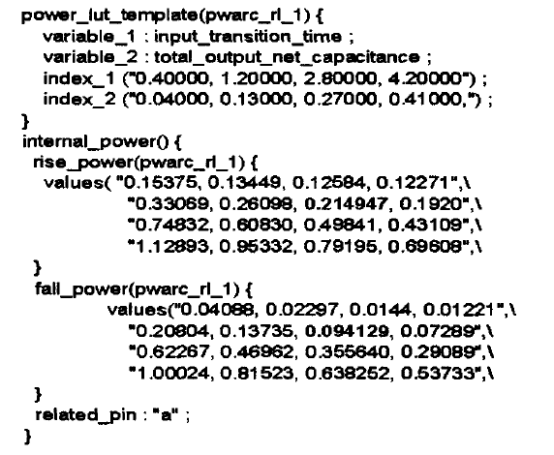 我們從前面知道,開關(guān)功耗主要就是對輸出電容的充放電引起的,工藝庫中有開關(guān)功耗有關(guān)的信息,如下所示: