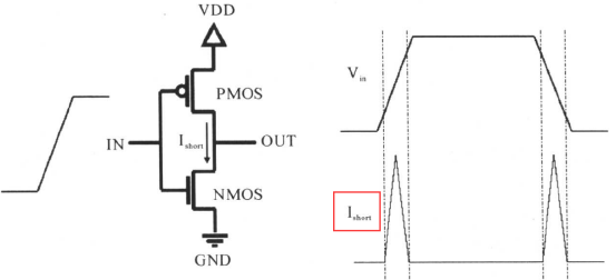 短路功耗也稱為內(nèi)部功耗,短路功耗是因為在輸入信號進行翻轉(zhuǎn)時,信號的翻轉(zhuǎn)不可能瞬時完成,因此PMOS和NMOS不可能總是一個截止另外一個導(dǎo)通,總有那么一段時間是使PMOS和NMOS同時導(dǎo)通,那么從電源VDD到地VSS之間就有了通路,就形成了短路電流,如下面的反相器電路圖所示: