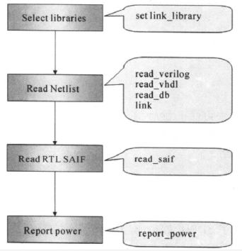 有了門級網(wǎng)表、gate backward SAIF文件和SDF文件,就可以在power compiler中進(jìn)行功耗分析了,分析功耗的流程圖如下所示:
