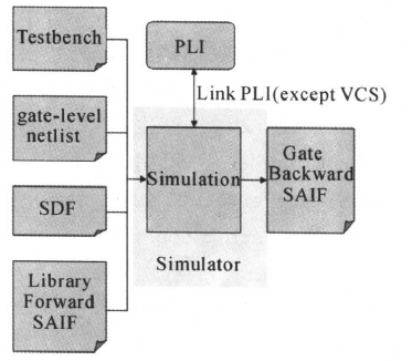 從上圖中我們可以看到,產(chǎn)生gate backward SAIF需要testbench測試平臺、門級網(wǎng)表、標(biāo)準(zhǔn)延時格式(standard delay format)文件SDF、庫SAIF文件。其中SDF文件反標(biāo)了門級網(wǎng)表中的RC延時參數(shù)等,可以更為準(zhǔn)確地得到線網(wǎng)的延時。
