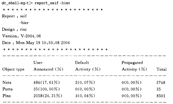 開關(guān)行為可以被清除,使用“reset_switching_activity”命令可以清除所有被標(biāo)記的翻轉(zhuǎn)率和通過傳輸?shù)玫降姆D(zhuǎn)率。用report_saif可以顯示讀入saif文件后設(shè)計中的開關(guān)行為信息。一個完整的SAIF文件,"user annotated”應(yīng)該是100%。如果SAIF不完整,那么默認(rèn)的翻轉(zhuǎn)率將附加到輸入端和黑盒子的輸出端。翻轉(zhuǎn)率通過零延遲仿真?zhèn)鬏斚氯?,這樣就可以計算出設(shè)計的功耗。