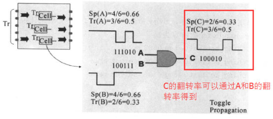 需要說明的是,傳播不可以穿過沒有功能描述的黑盒子,也就是不能通過傳播的方式得到黑盒子的輸出翻轉(zhuǎn)率,因此我們在最前面就定義了,將黑盒子的輸出當(dāng)做起點,這樣其他節(jié)點的翻轉(zhuǎn)率可以通過傳播得到(包括黑盒子的輸入),黑盒子輸出的翻轉(zhuǎn)率通過默認(rèn)設(shè)置的翻轉(zhuǎn)率得到,我們就得到了設(shè)計中所有節(jié)點的翻轉(zhuǎn)率。