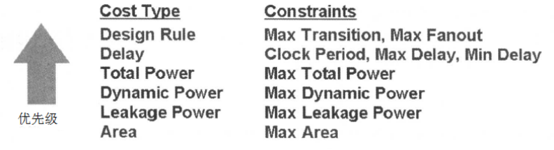 由此我們可以找到, 優(yōu)化時(shí),所產(chǎn)生的電路首先要滿足設(shè)計(jì)規(guī)則的要求,然后滿足延遲(時(shí)序)約束的要求,在滿足時(shí)序性能要求的基礎(chǔ)上,進(jìn)行總功耗的優(yōu)化,再進(jìn)行動(dòng)態(tài)功耗的優(yōu)化和漏電功耗的優(yōu)化,最后對(duì)面積進(jìn)行優(yōu)化。