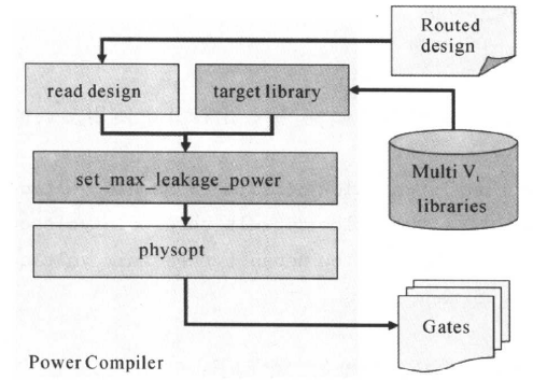 上面是門級(jí)網(wǎng)表/RTL代碼的多閾值電壓設(shè)計(jì),下面簡單介紹布線后的多閾值電壓設(shè)計(jì),流程如下圖所示:
