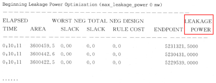 LEAKAGE POWER的列(Column)展出了內(nèi)部優(yōu)化的漏電成本值。它和報(bào)告出來的漏電功耗可能不一樣。我們用“report_power”命令得到功耗的準(zhǔn)確的報(bào)告。