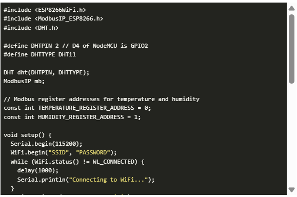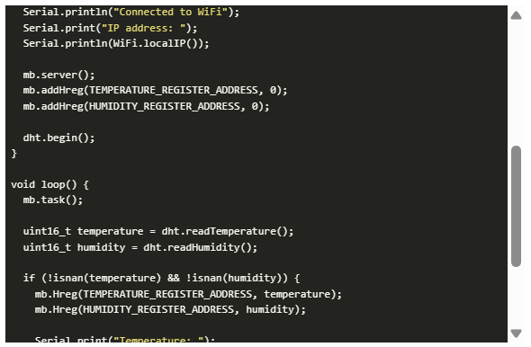 為了將DHT11傳感器數(shù)據(jù)發(fā)布到Modbus TCP服務(wù)器,我們需要在NodeMCU和Modbus TCP服務(wù)器之間建立連接。下面的代碼演示了如何在NodeMCU和Modbus TCP服務(wù)器之間建立連接并發(fā)布DHT11傳感器數(shù)據(jù)。