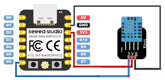 ?首先將DHT11傳感器連接到XIAO ESP32C3微控制器。為此,我們將使用數(shù)字引腳D6。